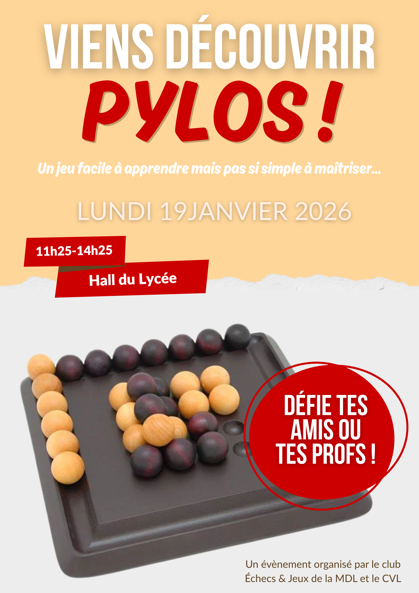Le lundi 19 janvier 2026 de 11h30 à 14h30, le club Echecs et jeux de société de la MDL et le CVL (...)